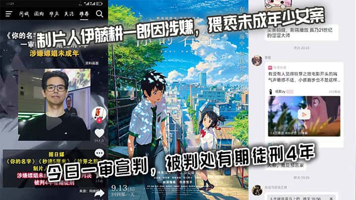 《你的名字》《秒速5厘米》《铃芽之旅》制片人伊藤耕一郎因涉嫌,猥亵u成年少女 案,今日一审宣判,被判处有期徒刑4年。